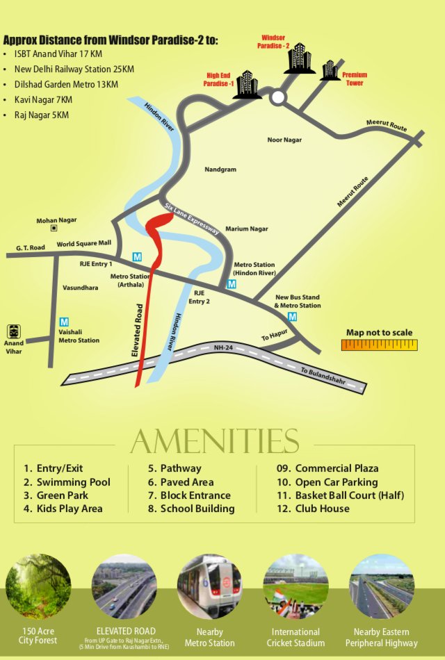 Windsor Paradise 2 in Raj Nagar Extension, Ghaziabad by Windsor Infrastructure is a residential project. The project offers Apartment with perfect combination of contemporary architecture and features to provide comfortable living. The Apartment are of the following configurations: 2BHK, 3BHK and 4BHK Windsor Paradise 2 offers facilities such as Gymnasium and Lift. It also has amenities like Badminton court, Basketball court, Jogging track, Lawn tennis court and Swimming pool. It also offers Car parking. The project is Vastu complaint. This is a RERA registered project with registration number UPRERAPRJ7424. Bank loan approved from HDFC Home Loans, ICICI Bank, State Bank of India, Corporation Bank, Punjab National Bank, AXIS Bank, Indiabulls, Reliance Home Finance and Dewan Housing Finance Corporation Limited DHFL